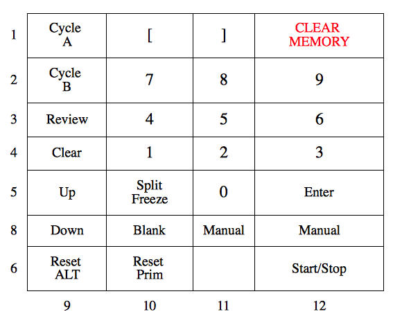 The clock comes with a 27 key membrance keypad. Internally, this keypad uses a 14 conductor edge connector. The keypad is a simple row/column arrangement EXCEPT FOR THE TOP RIGHT KEY LABELLED ‘CLEAR MEMORY’. The CLEAR MEMORY key has its own two conductors, numbered 13 and 14. The diagram below shows how the conductors are assigned to rows and columns. AFAIK conductor 7 is not used.
