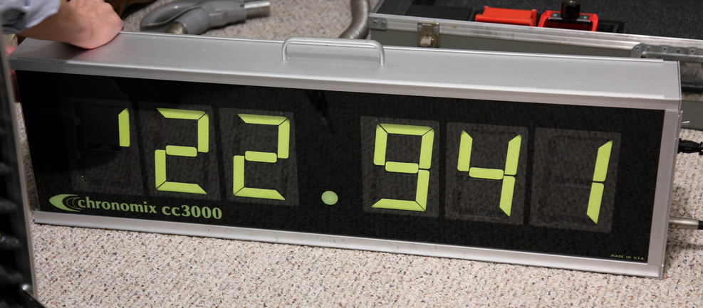 The Chronomix cc3000 race clock uses signalex flip digits. There are several versions of this old clock design. It may have five or six digits on a side. Some clocks are double sided, others are single sided. The glass face may be replaced to show the decimal point at different locations. AFAIK, all chronomix clocks use the six inch signalex digit.
