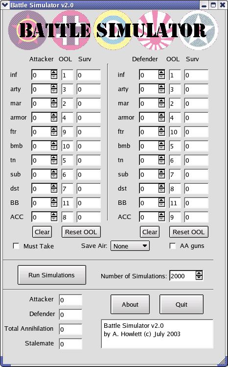 Save air: There are two save air options. Absolute save air means that if there is any chance of an attacking air unit being hit, then the air units must retreat. Average save air means that if there is an average chance of an air unit being hit then the air units must retreat. The average number of attackers lost is calculated by adding the defence factors of all defenders (except subs) and dividing by six. OOL: OOL values represent the loss precedence. Units with lower loss precedence are lost before units with higher precedence. For instance, if you want everything else to be lost before your bombers, change the bomber ool value to 99. Installation: This file contains the source, which has been precompiled for my platform (i686-linux-gnu). If necessary, you can recompile for your own platform by entering " make " in the top level directory. " make install " should install it on your system. License: This application is distributed under the GNU General Public License. |