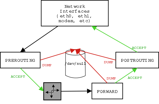 The diagram above shows what's going on in a firewall running iptables. The top of the diagram represents the network interfaces (ethernet cards, modems, ppp, etc). This is where IP packets enter and exit the machine. Packets entering the machine first go to the routing process. The routing process determines whether the incoming packet is destined for a local process (an application running on the firewall machine) or if the packet should be forwarded to another computer. We will discuss dedicated firewall machines, so we will ignore local processes and the corresponding INPUT and OUTPUT chains. For a dedicated firewall, all packets must be forwarded, so we will assume that the packet is routed to the FORWARD chain. The forward chain compares the incoming packet to its preprogrammed sequence of rules. If one of the rules ACCEPTs the packet, then the packet is sent back to the network interfaces to be forwarded to the destination network. If one of the rules DUMPs the packet, then the packet is sent to /dev/null (an electronic trash can). What happens if none of the rules issue an ACCEPT or DUMP command? Then the packet is said to "fall off the end of the chain". For every chain, the sysadmin must define the default action which occurs when a packet falls off the end. The default action for a firewall should be DUMP. Why DUMP? Because the ideology of a firewall should be "If I haven't explicitly accepted the communication, then the communication should be denied."