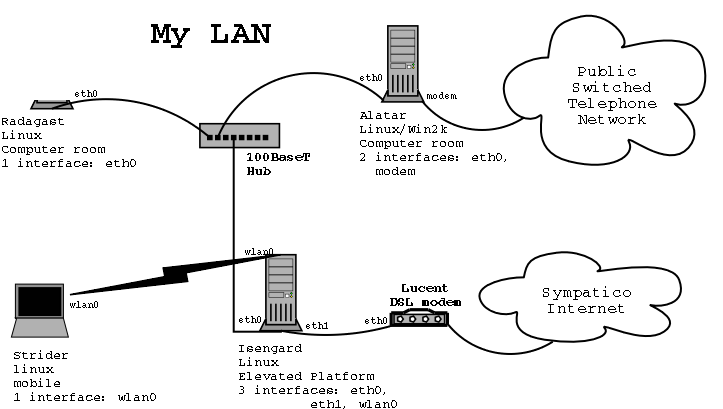 This might look like a lot of information: too much to fit on the diagram. In fact, I usually put the interface details on the back of the diagram, and just label the interface names on the diagram. This puts all the information I need to solve 90% of network errors in my pocket. Here are examples of my network diagrams.