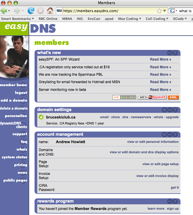 No one likes to enter IP addresses in the URL. Most people prefer names to numbers. Also, if you are behind a DSL or cable modem then your IP address could change. Names are handy because you can publish your web page's name and just change the mapping between your IP address and name. So you need to purchase a domain name and pay for dynamic DNS service. There are many companies that provide this service. godaddy.com is probably the cheapest, but it doesn't support canadian .ca domain names. So I use easydns.com – it supports canadian TLD (top level domain) and is reasonably priced. Another place to consider is domainsatcost.ca, but as far as I know they don't provide dynamic DNS.