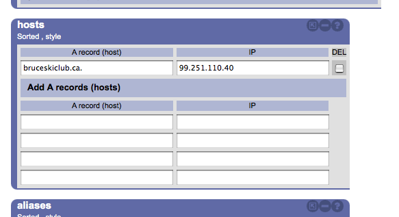 This is where the DNS remembers what IP address belongs to this domain name. I also like to make an alias, because some people like to type in www.bruceskiclub.ca, while others prefer just bruceskiclub.ca. I can create the alias in the alias section:
