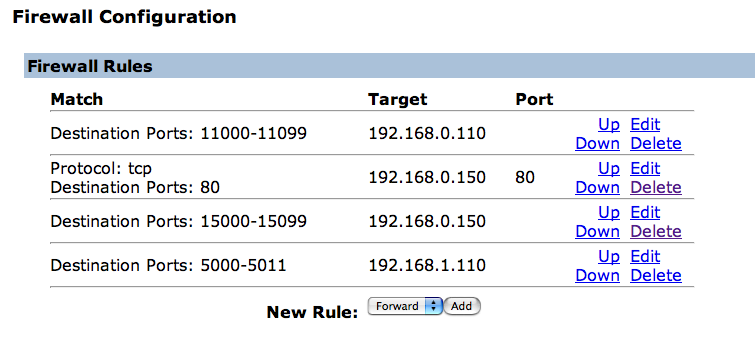 Now we can set up port forwarding. My router is a Linksys WRT54GL running OpenWRT. Here's a screenshot of my port forwarding setup: