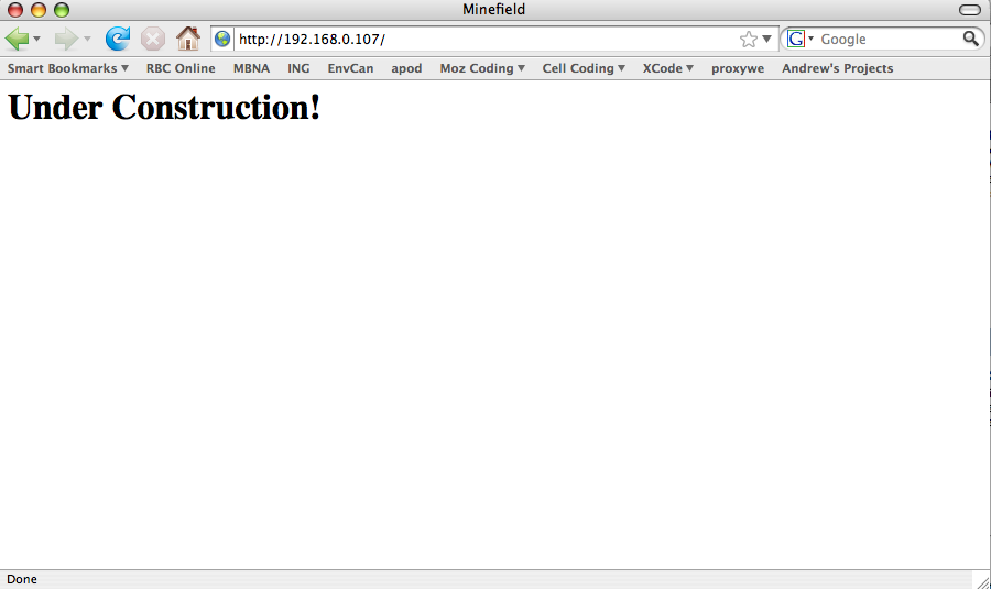 My external IP address is 99.251.110.40. So now, if I went to another person's house, or a public library, and typed in the URL http://99.251.110.40 then I would see my Under Construction web page. But here's a short cut. Instead of going to someone else's house, aim your web browser at http://www.proxyweb.net then enter http://99.251.110.40 (substitute your own IP address of course!) and you should see what your web page looks like to the outside world.