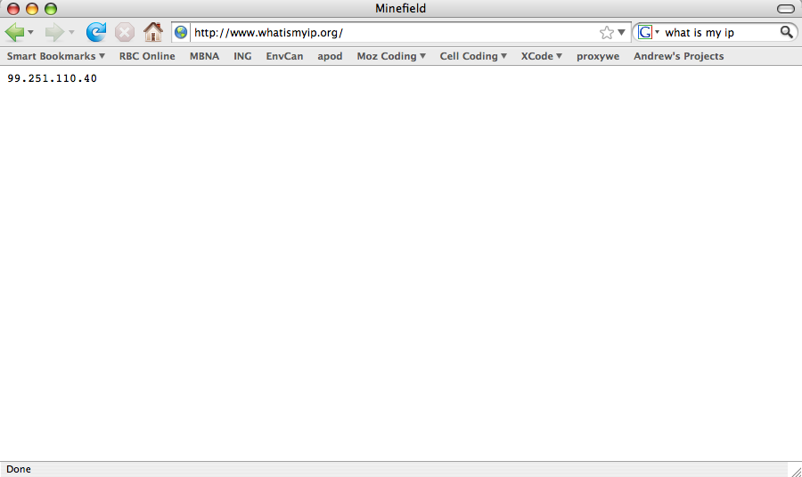 Now you need to know your external IP address. This is the IP address that the rest of the world sees when it talks to your router. Go to your workstation and aim the browser at http://www.whatismyip.org. You should see something like this: