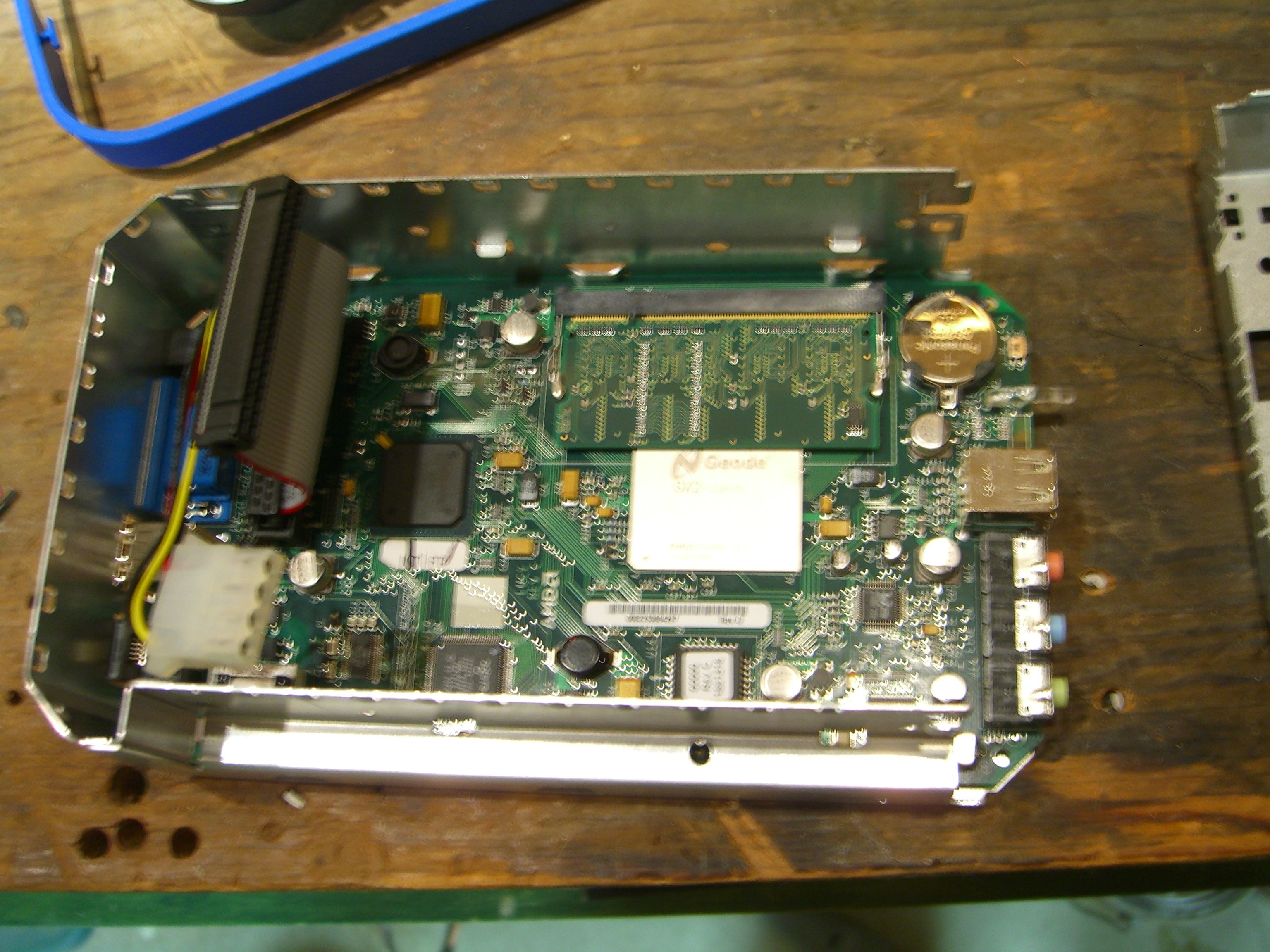 Now you can gently remove the hard drive. Sorry about the blurry photo. I am a poor photographer. Hopefully you can make out the PC2700 SODIMM at the upper right corner of the board, next to the CMOS battery. The RAM is mounted directly over the Geode CPU.